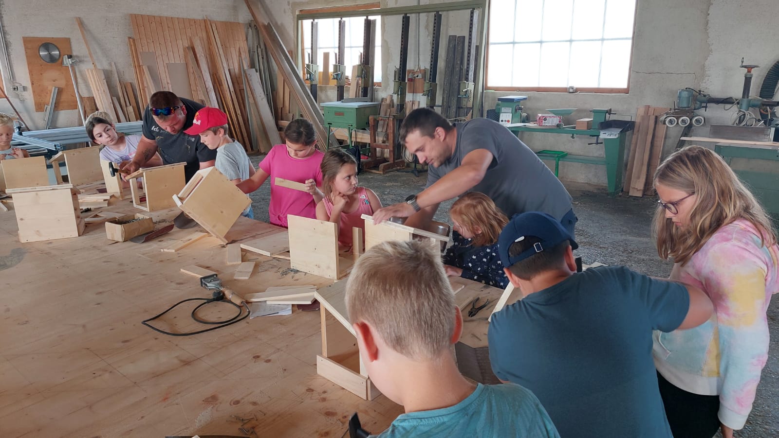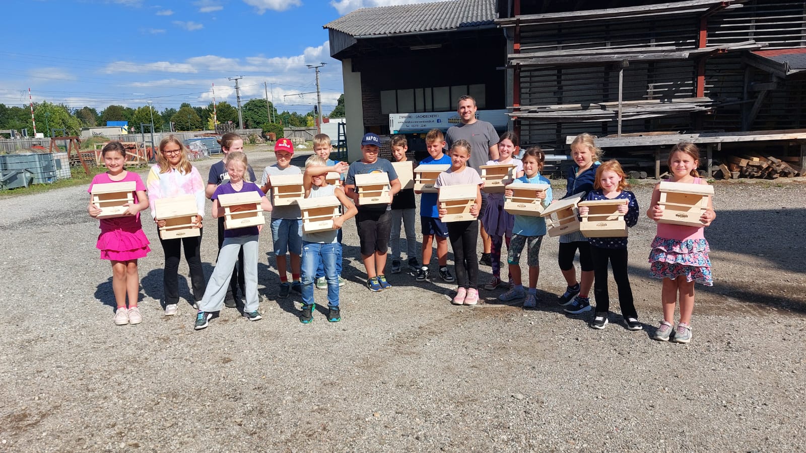 eine große Schar an Kindern hat ein Vogelhaus gebastelt.